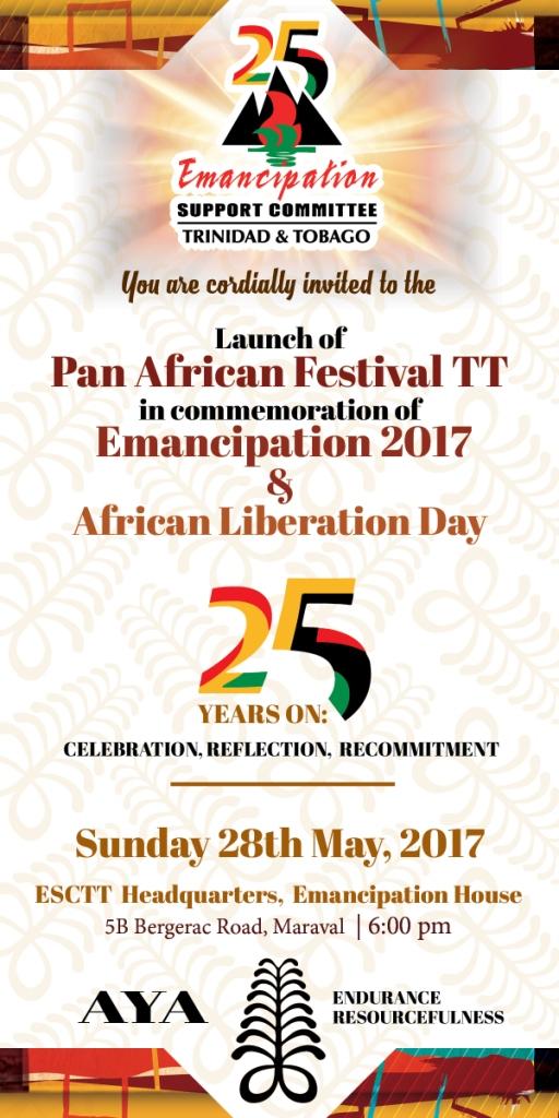 You are cordially invited to the launch of 2017 Pan African Festival TT in commemoration of Emancipation 2017 and African Liberation Day at the Emancipation House at 5B Bergerac Road, Maraval.