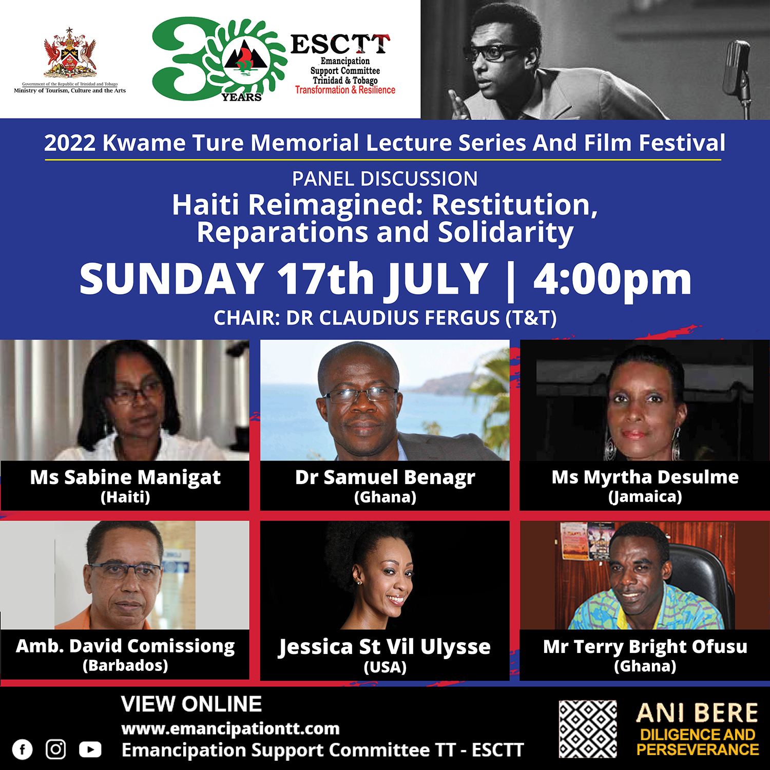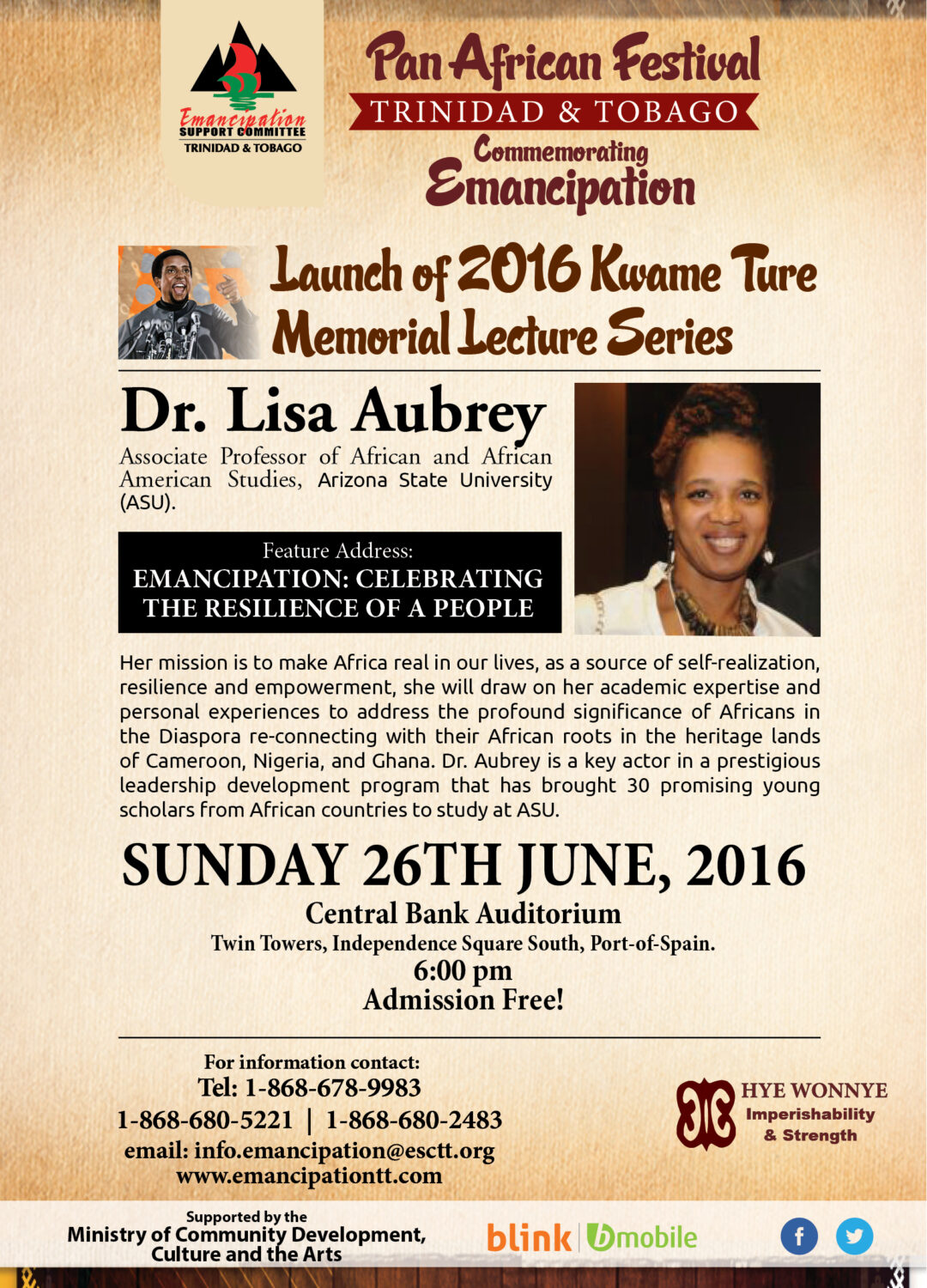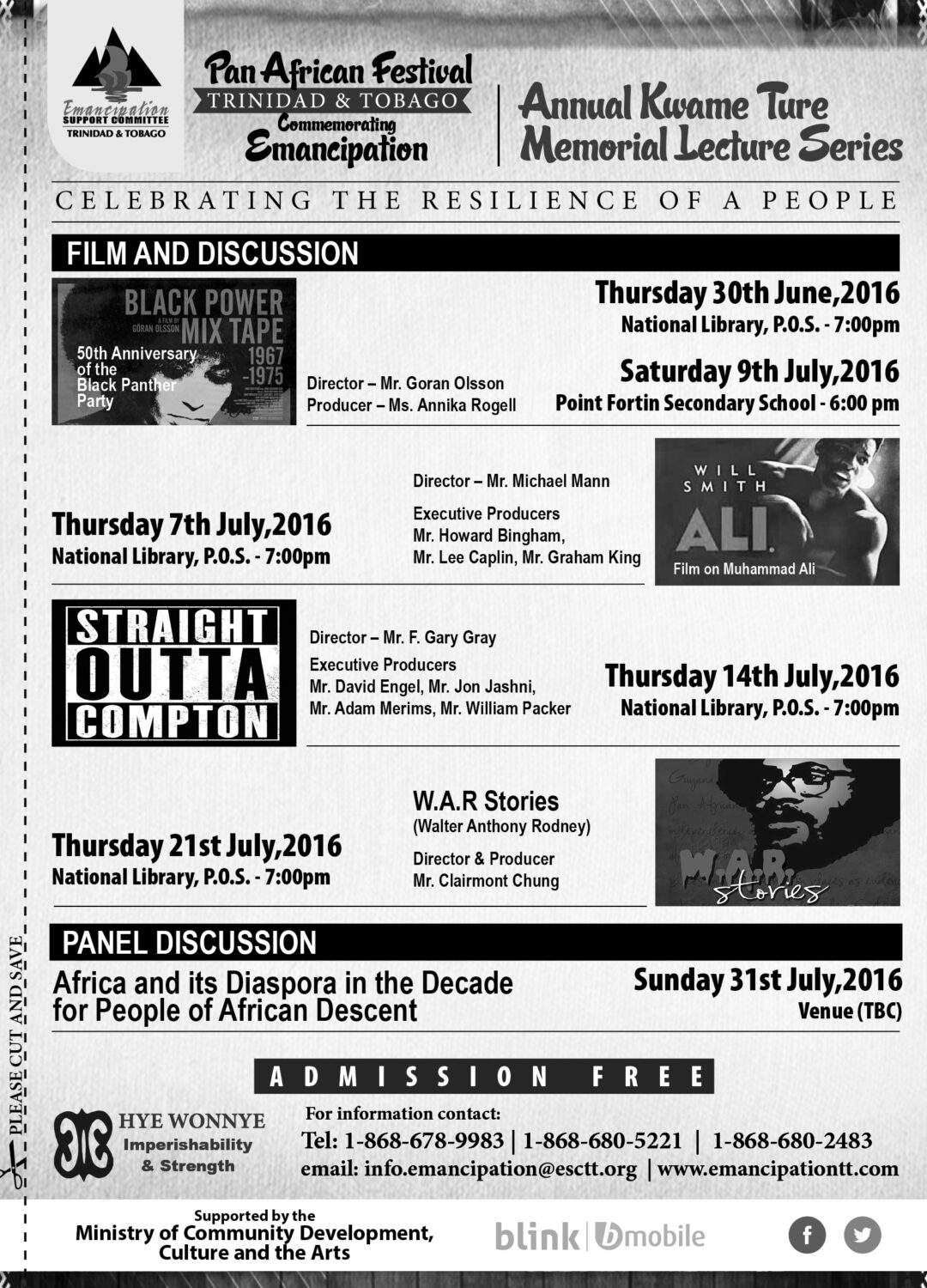 A critical forerunner to the Emancipation celebrations. The lecture series is named after prominent civil rights activist, Kwame Ture, whose lifelong desire was the edification and empowerment of all African people. Using compelling lectures, presentations, youth panels and video, the lecture series attempts to perpetuate Ture’s legacy – building the awareness, consciousness and intellect of African peoples to better control their destiny and their social and economic well-being.