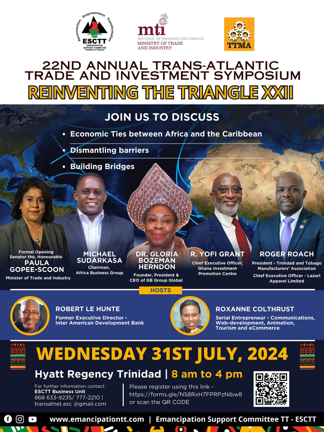 The Emancipation Support Committee of Trinidad and Tobago (ESCTT) in collaboration with the Africa Business Group presents the 2025 Trans-Atlantic Trade and Investment Symposium – “Opportunities for Economic Diversification and Resilience through Expansion of Trade and Investment with West Africa”.